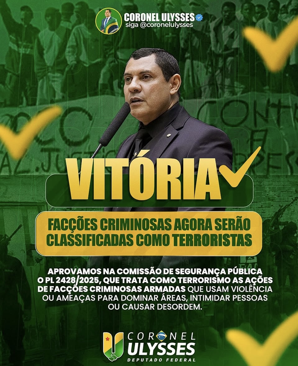 O deputado Coronel Ulysses comemorou nesta quarta-feira (3) a aprovação, na Comissão de Segurança Pública e Combate ao Crime Organizado, do Projeto de Lei nº 2428/2025, que prevê a tipificação de atos cometidos por facções criminosas armadas como terrorismo.