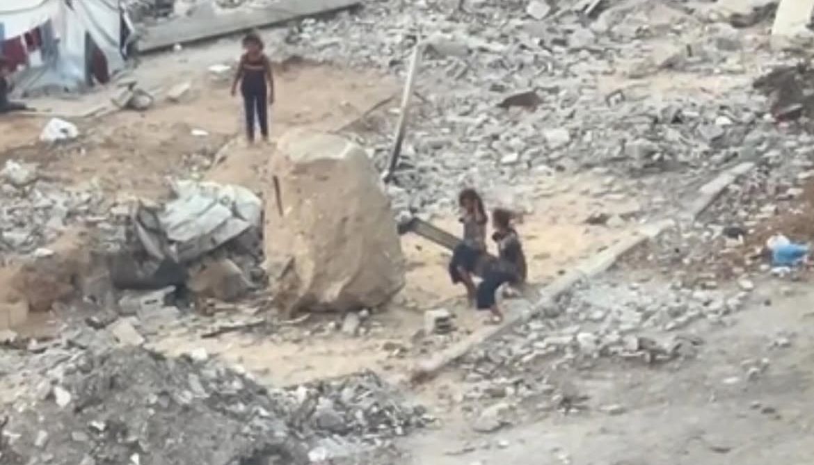Em meio à devastação causada pela guerra em Gaza, duas crianças foram flagradas brincando em uma gangorra improvisada, construída entre escombros e destroços de prédios destruídos. O vídeo, compartilhado nas redes sociais, mostra como a população infantil palestina busca momentos de normalidade mesmo diante do cenário de conflito.