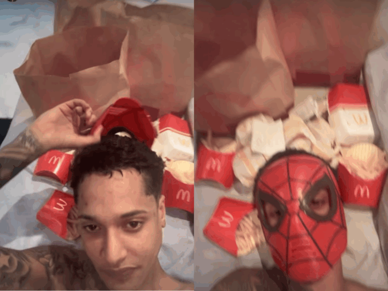 Em suas redes sociais, o artista, compartilhou alguns registros cercado por diversos lanches de uma rede famosa de fast food: “Eu estava doido para comer isso”, disse, cercado por hambúrgueres e batatas fritas. Ele utilizou uma máscara de Homem-Aranha nos registros.