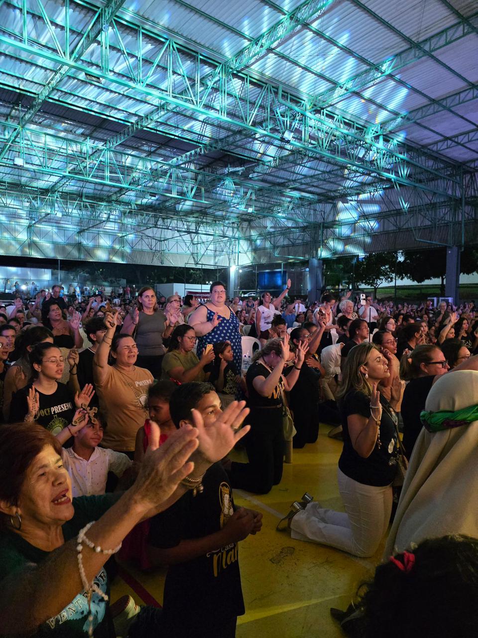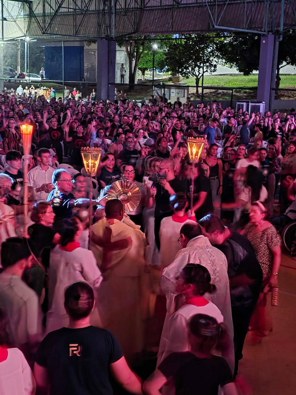 O ponto mais marcante da noite foi, sem dúvidas, a Adoração ao Santíssimo Sacramento. Um momento de céu aberto, em que as sete voltas foram dadas ao redor do ginásio, representando a queda das muralhas, como em Jericó.