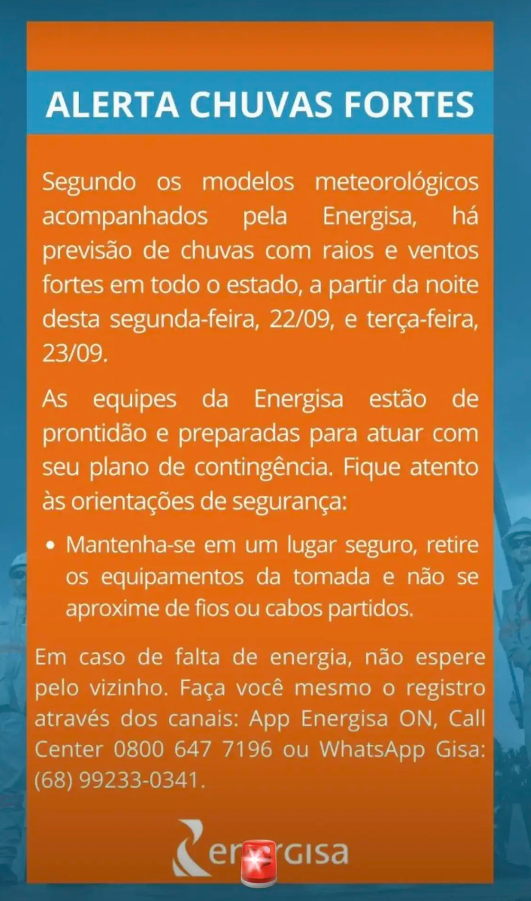 Em casos de interrupção no fornecimento de energia, a empresa destaca que o registro deve ser feito diretamente pelo consumidor, utilizando os canais oficiais: aplicativo Energisa ON, call center 0800 647 7196 ou o WhatsApp Gisa no número (68) 99233-0341.