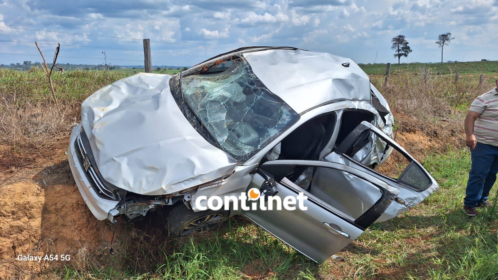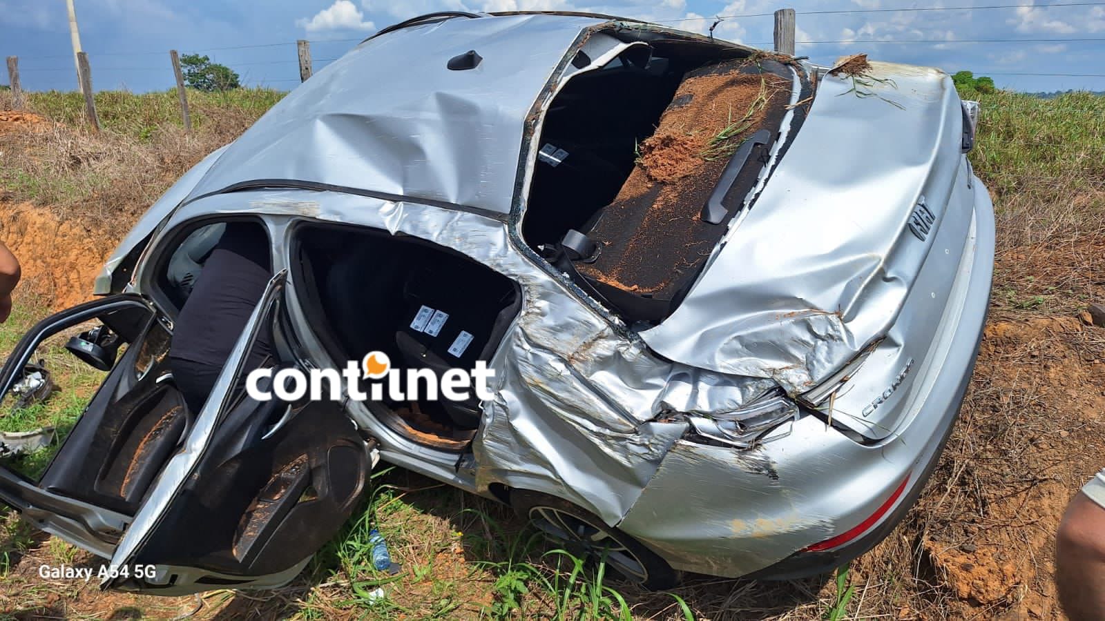 Imagens registradas após o acidente mostram o automóvel bastante danificado às margens da estrada.
