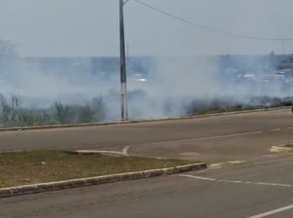 Vídeos registrados no local mostram o fogo se espalhando rapidamente pela vegetação seca, formando labaredas altas e uma intensa fumaça.