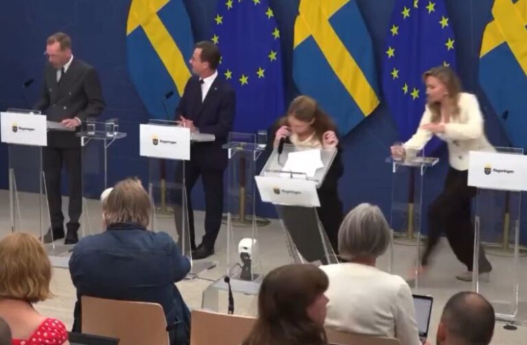 Ministra da Saúde da Suécia desmaia e cai no chão durante coletiva. Foto: Reprodução