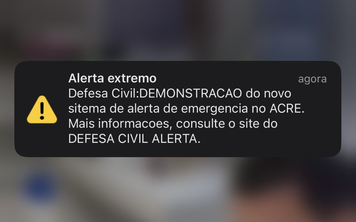 A população de quatro cidades acreanas recebeu neste sábado (20) uma simulação do sistema de mensagens de emergência da Defesa Civil. O aviso foi encaminhado de forma aleatória para celulares em Rio Branco, Brasiléia, Cruzeiro do Sul e Jordão, sem necessidade de cadastro prévio por parte dos moradores.
