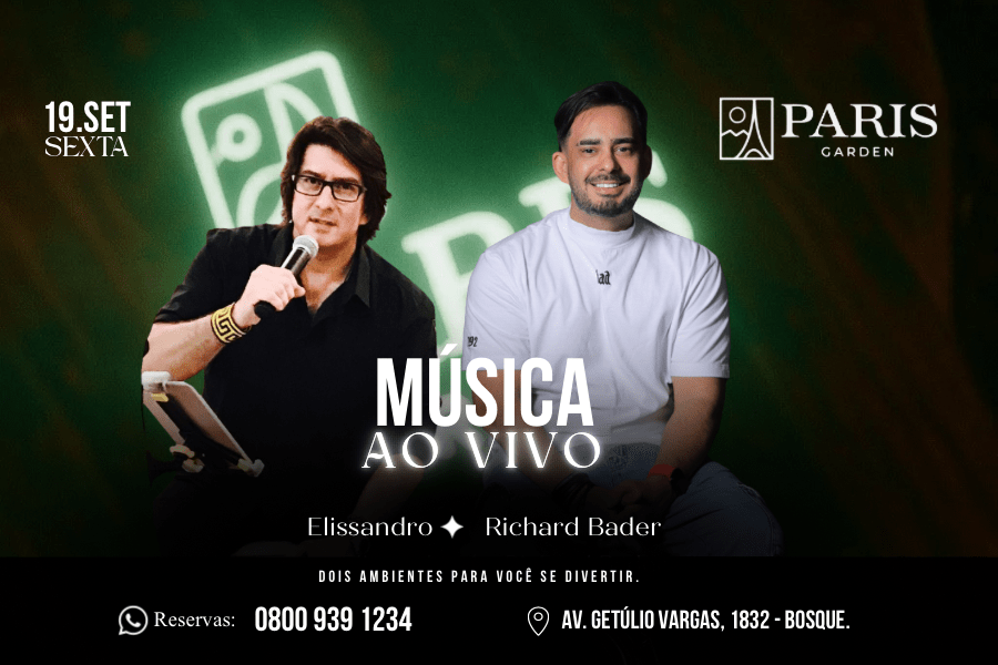 O Paris Garden promove nesta sexta-feira (20) uma programação com dois ambientes musicais para o público. No espaço, a animação ficará por conta das apresentações ao vivo de Elissandro e Richard Bader, que se revezam para atender diferentes estilos e gostos musicais.