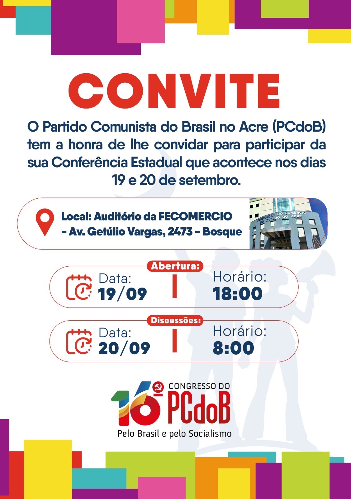O Partido Comunista do Brasil (PCdoB) realiza sua Conferência Estadual Ordinária nesta sexta-feira (19) e sábado (20), no Auditório da Fecomercio, situado na Avenida Getúlio Vargas, no Bosque, em Rio Branco.