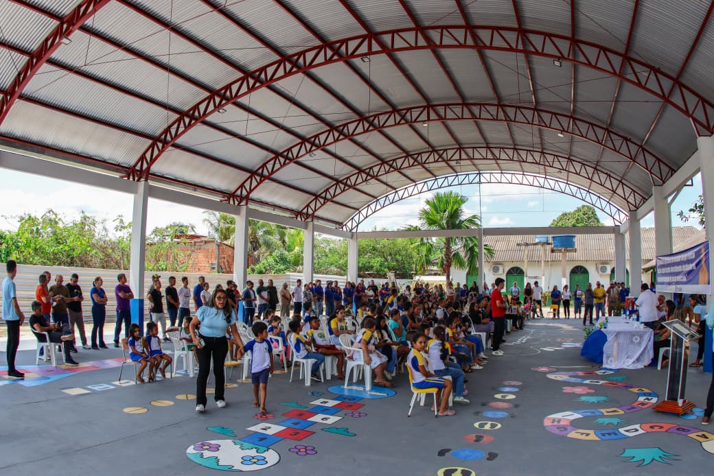 Estudantes e professores celebram a nova quadra e espaço recreativo, que trará mais qualidade às atividades escolares, esportivas e culturais/Foto: Ascom