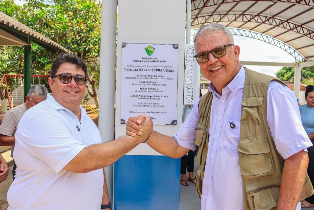 A cerimônia contou com a presença do prefeito Carlinhos do Pelado, do vice-prefeito Amaral do Gelo, da secretária municipal de Educação, Raiza Dias, da vereadora Lucélia Borges, representando a câmara de vereadores, além do autor da emenda, senador Sérgio Petecão, e da gestora da escola Vitória Salvatierra Cesar, Rocilene da Silva.