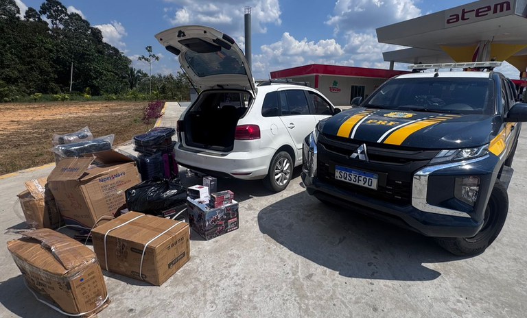 A abordagem ocorreu por volta das 12h54, quando os agentes deram ordem de parada a um veículo. Durante a inspeção, foram encontrados caixas e pacotes contendo eletrônicos, utensílios domésticos, roupas, bolsas e brinquedos. Os ocupantes informaram não possuir notas fiscais que comprovassem a origem dos produtos.
