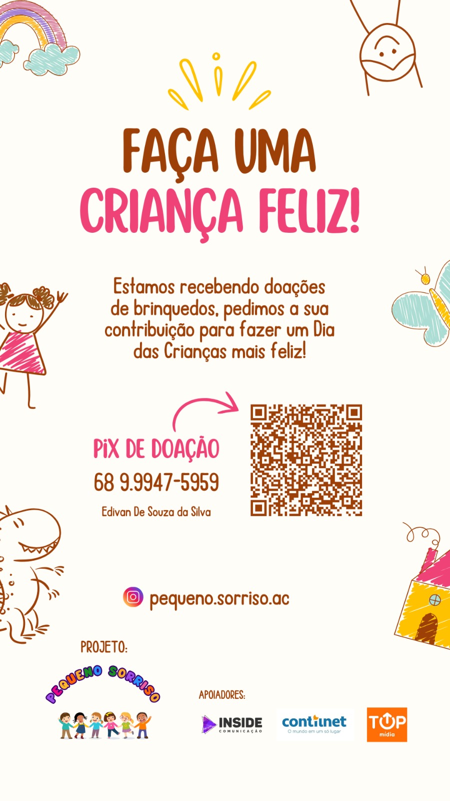 Desde 2019, a iniciativa passou a ser realizada em Rio Branco, onde o projeto acontece todos os anos no Dia das Crianças, espalhando sorrisos e alegria pelas comunidades. Neste ano, o Projeto Pequeno Sorriso focará na arrecadação de brinquedos, que serão entregues em hospitais e UPAs da capital acreana.