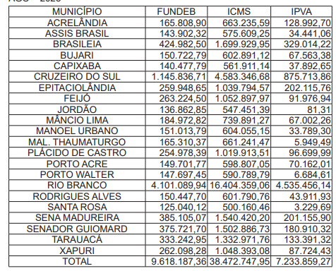 A Secretaria de Estado da Fazenda do Acre (Sefaz-AC) divulgou no Diário Oficial desta segunda-feira (8) o demonstrativo da arrecadação estadual referente ao mês de agosto de 2025. O documento detalha os valores repassados aos municípios acreanos a partir de três fontes: Fundeb, ICMS e IPVA.