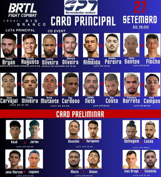 O BRTL Fight Combat confirmou o card completo da 9ª edição do evento, que será realizada no dia 27 de setembro (sexta-feira), a partir das 19h, no Maison Borges Eventos, em Rio Branco.