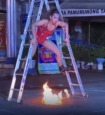 Uma apresentação quase terminou em tragédia quando uma mulher acidentalmente encostou sua roupa no fogo e só percebeu após realizar um salto conhecido como estrelalateral, assustando o público.