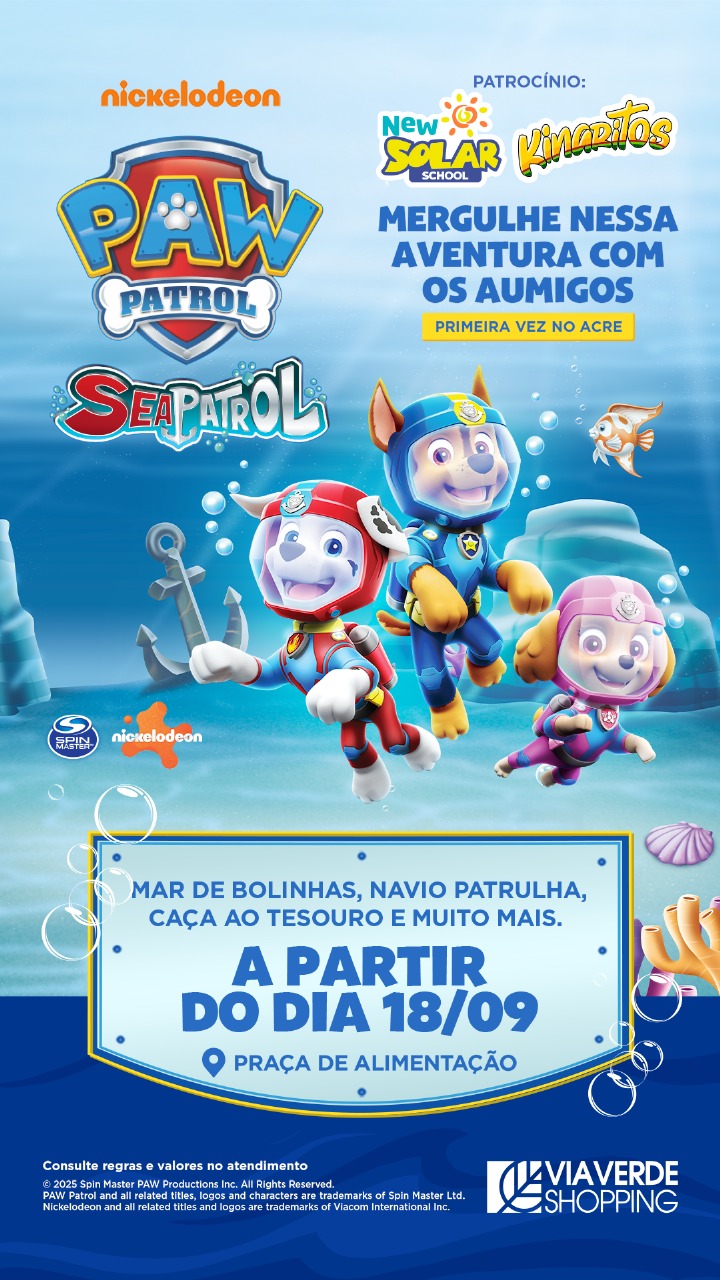 “Trazer a Patrulha Canina Sea Patrol pela primeira vez ao Acre é motivo de grande alegria. Nosso objetivo é proporcionar experiências inéditas, que encantem crianças e fortaleçam os momentos em família. Queremos que cada visita ao Via Verde Shopping seja lembrada como um momento único e cheio de alegria”, destaca Daniel Ferreira, coordenador de Marketing do Via Verde Shopping.
