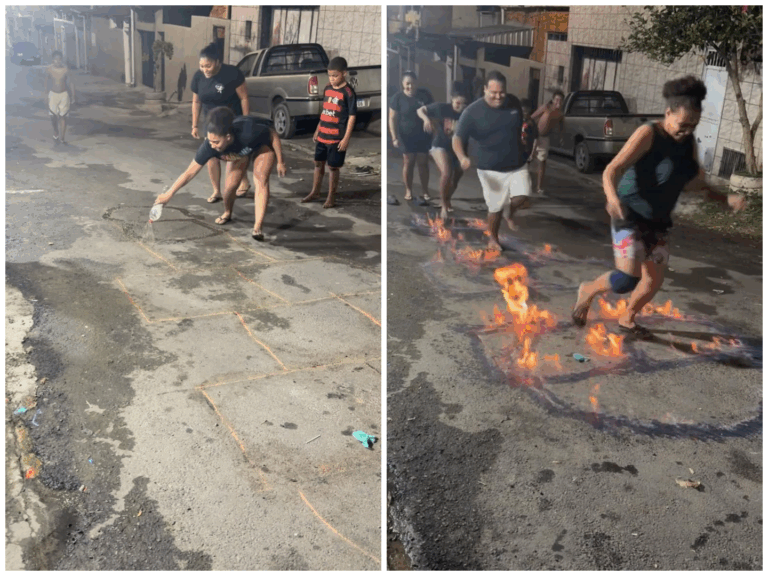 Enquanto os participantes tentam pular pelas casas da amarelinha, as chamas avançam rapidamente. A cada movimento, Ă© possĂvel ver a tensĂŁo e a euforia de quem assiste. PorĂ©m, no final do vĂdeo, uma grande labareda toma conta da ĂĄrea, assustando os presentes e provocando gritos de espanto.