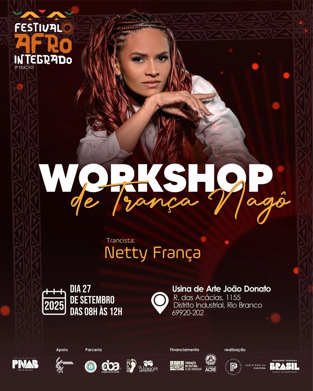 O workshop será uma oportunidade para aprender, trocar experiências e valorizar os saberes que fortalecem a estética e a cultura afro-brasileira. O evento acontecerá na Usina de Arte João Donato, em Rio Branco, das 08h às 12h, e as vagas são limitadas e gratuitas.