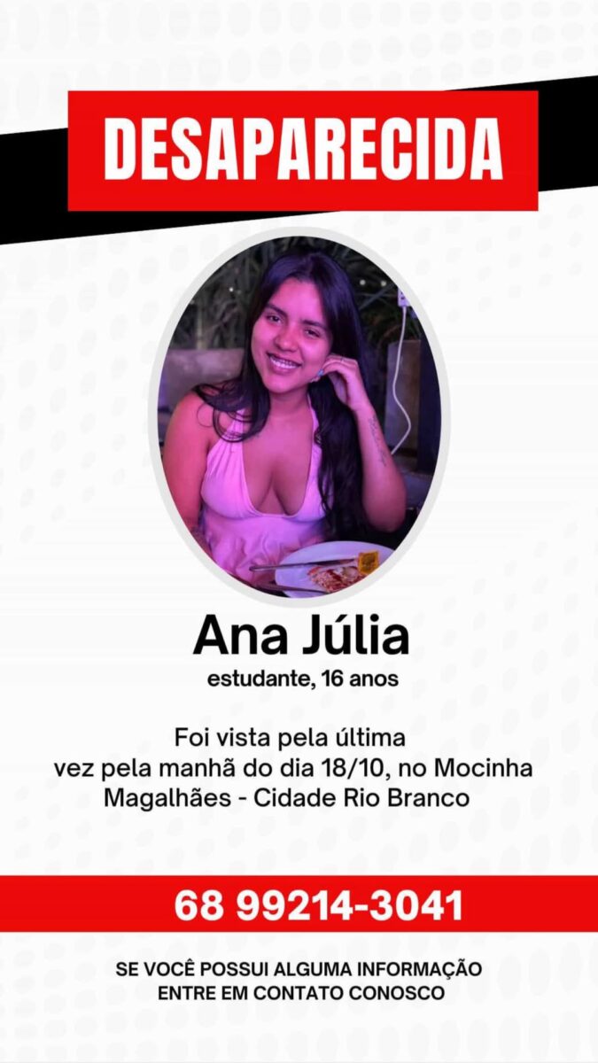 A adolescente Ana Julia, de 16 anos, está desaparecida desde a manhã de sábado (18), no bairro Mocinha Magalhães, em Rio Branco. Familiares informaram que a jovem saiu de casa e não foi mais vista desde então, o que gerou preocupação entre parentes e amigos.