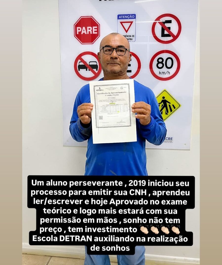 Segundo o post compartilhado por Martins, o estudante iniciou o processo em 2019 e, ao longo da trajetória, aprendeu a ler e escrever. Com o apoio da Escola Detran, superou as etapas e agora está próximo de receber a permissão para dirigir.