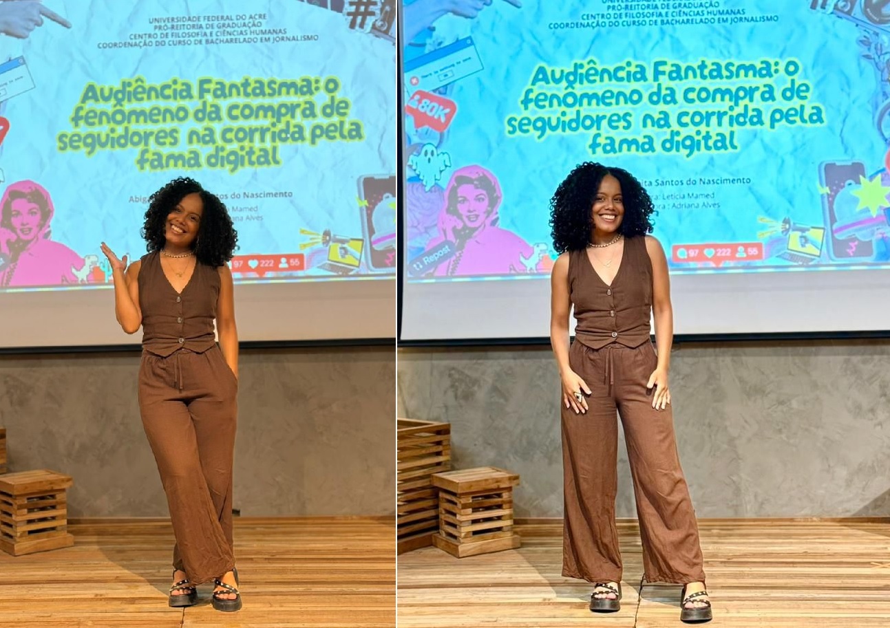 Depois de muita resiliência e dedicação, a jornalista e talentosa artista Abigail Sunamita apresentou no dia 8 de outubro, na Universidade Federal do Acre, o seu Trabalho de Conclusão de Curso – TCC. O tema, que consumiu a maior parte de seu tempo por meses foi “Audiência fantasma: o fenômeno da compra de seguidores na corrida pela fama digital”. Ela investigou como a busca incessante por números falsos (os “bots”) afeta a autenticidade e o engajamento real nas redes sociais. Foi uma jornada de descobertas que confirmou: a verdade e o engajamento orgânico ainda superam qualquer simulação de popularidade. O levantamento e resultado agradaram a banca que a aprovou com a nota máxima. Ela é nota dez em tudo o que faz!