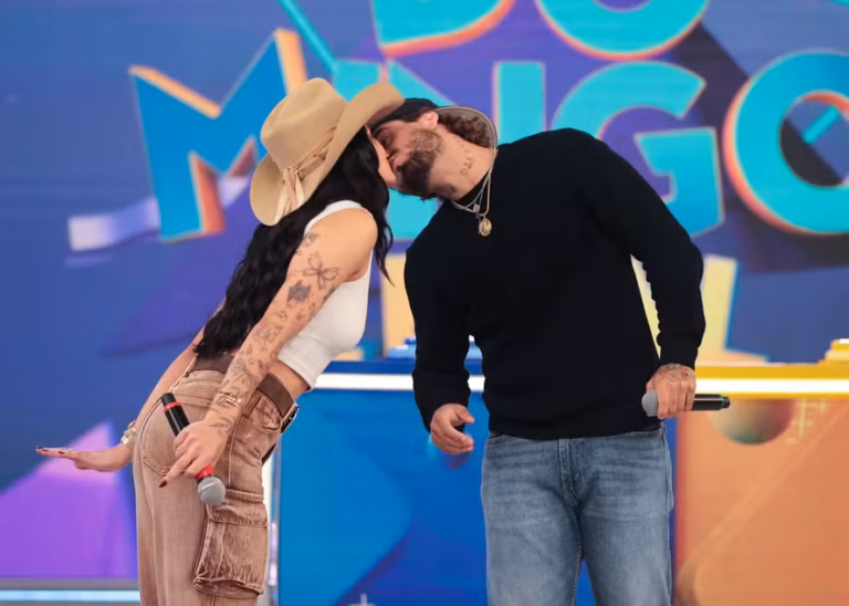 Ana Castela, de 21 anos de idade, e Zé Felipe, de 27, se beijaram, na tarde deste domingo (12), na gravação do quadro Passa ou Repassa, do programa Domingo Legal, no SBT. Durante a gravação, a dupla apresentou o feat que lançou no início do mês, Sua Boca Mente. Em um dos momentos da apresentação, Zé Felipe demonstrou carinho por Ana, dando um beijo no ombro da cantora. Depois, um selinho.