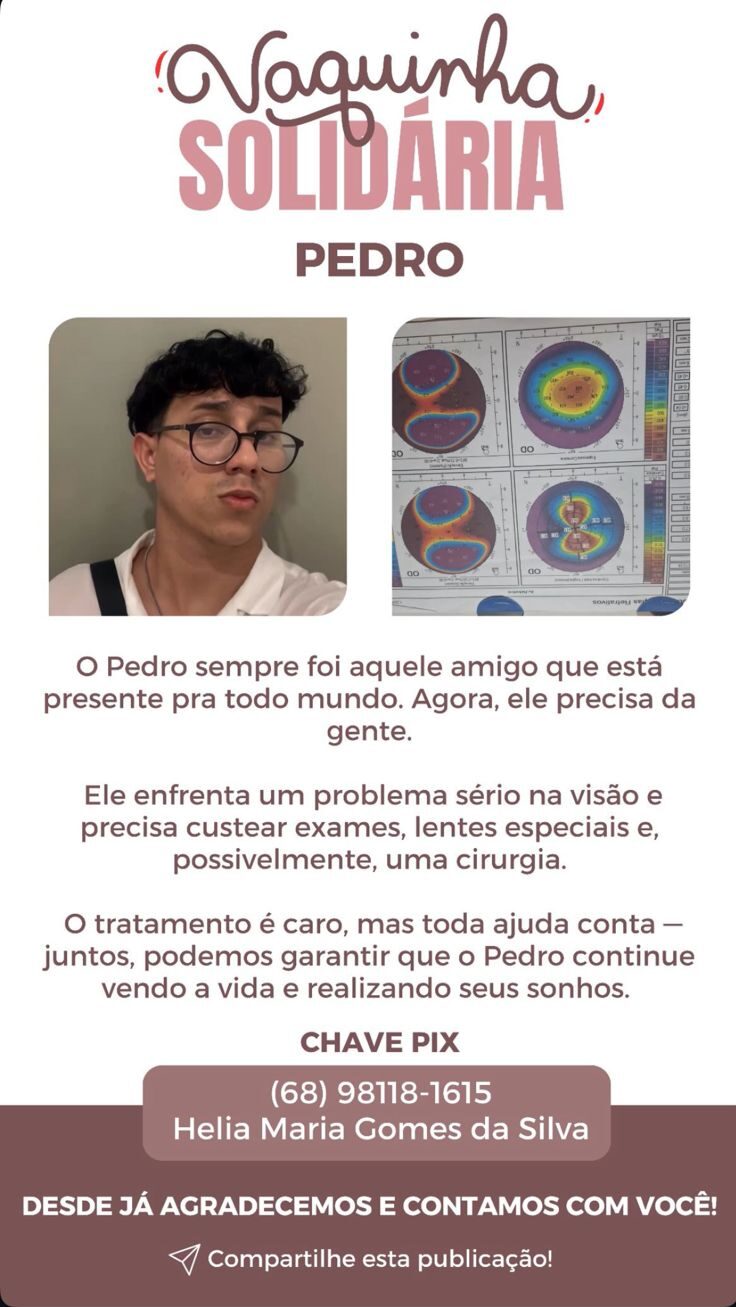 O tratamento é considerado caro, e familiares e amigos destacam que toda ajuda é importante para garantir que Pedro continue enxergando a vida e realizando seus sonhos.
