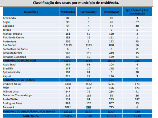 Os municípios mais afetados são Rio Branco, com 3.323 casos confirmados, seguido de Cruzeiro do Sul (2.572) e Tarauacá (270). Entre as cidades acreanas, apenas Santa Rosa do Purus ainda não registrou ocorrências neste ano.