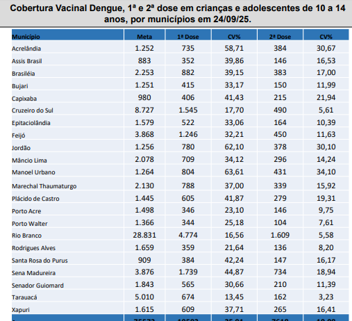 Apesar do avanço da vacinação, a cobertura ainda é considerada baixa. Segundo a Sesacre, apenas 25,91% da população recebeu a primeira dose, enquanto a segunda dose alcançou 10,08%. A imunização é vista como uma das principais estratégias para reduzir o impacto da doença nos próximos anos.