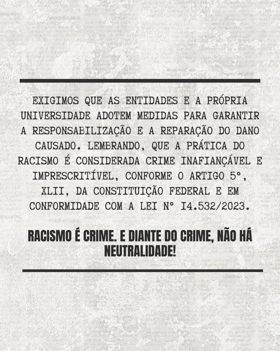 A nota ainda exige que a universidade e as entidades competentes adotem medidas para garantir a responsabilização e a reparação do dano causado. O documento lembra que o racismo é crime inafiançável e imprescritível, conforme o artigo 5º, XLII, da Constituição Federal, e em conformidade com a Lei nº 14.532/2023.