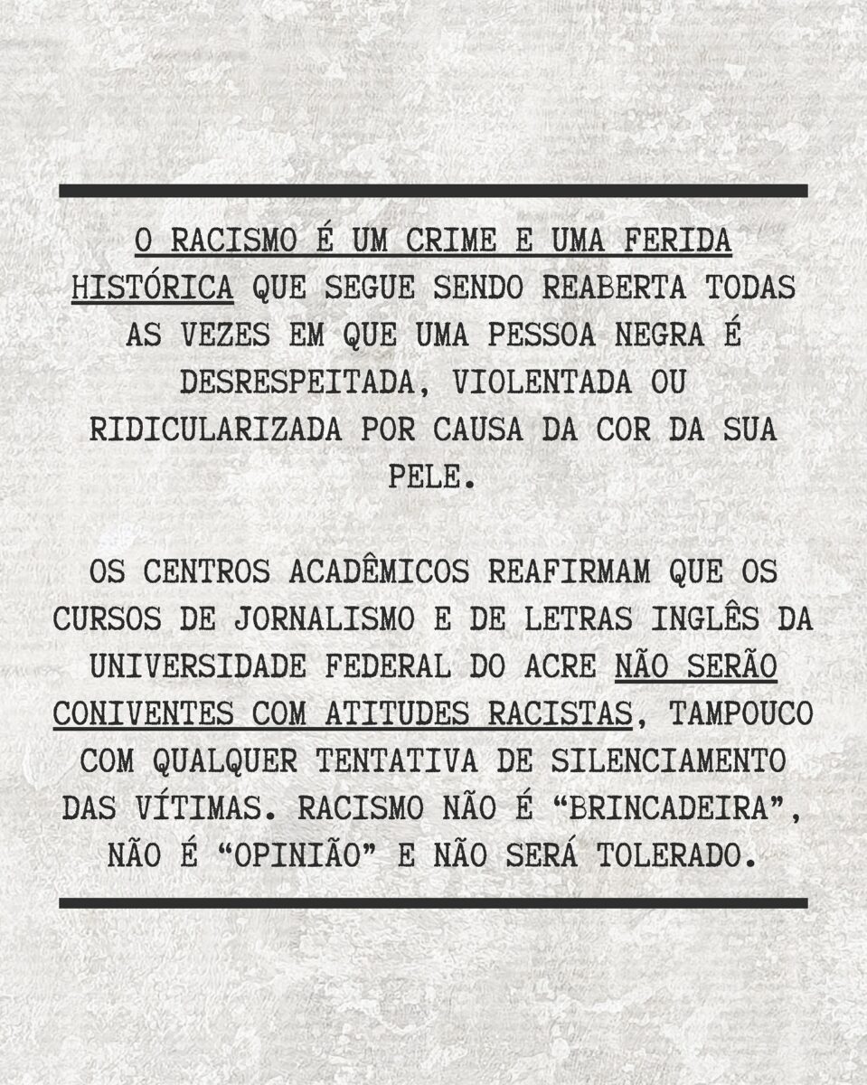 “O racismo é um crime e uma ferida histórica que segue sendo reaberta todas as vezes em que uma pessoa negra é desrespeitada, violentada ou ridicularizada por causa da cor da sua pele. Centros acadêmicos reafirmam que os cursos de Jornalismo e de Letras Inglês da Ufac não serão coniventes com atitudes racistas, tampouco com qualquer tentativa de silenciamento das vítimas. Racismo não é ‘brincadeira’, não é ‘opinião’ e não será tolerado”, afirmam os centros acadêmicos.