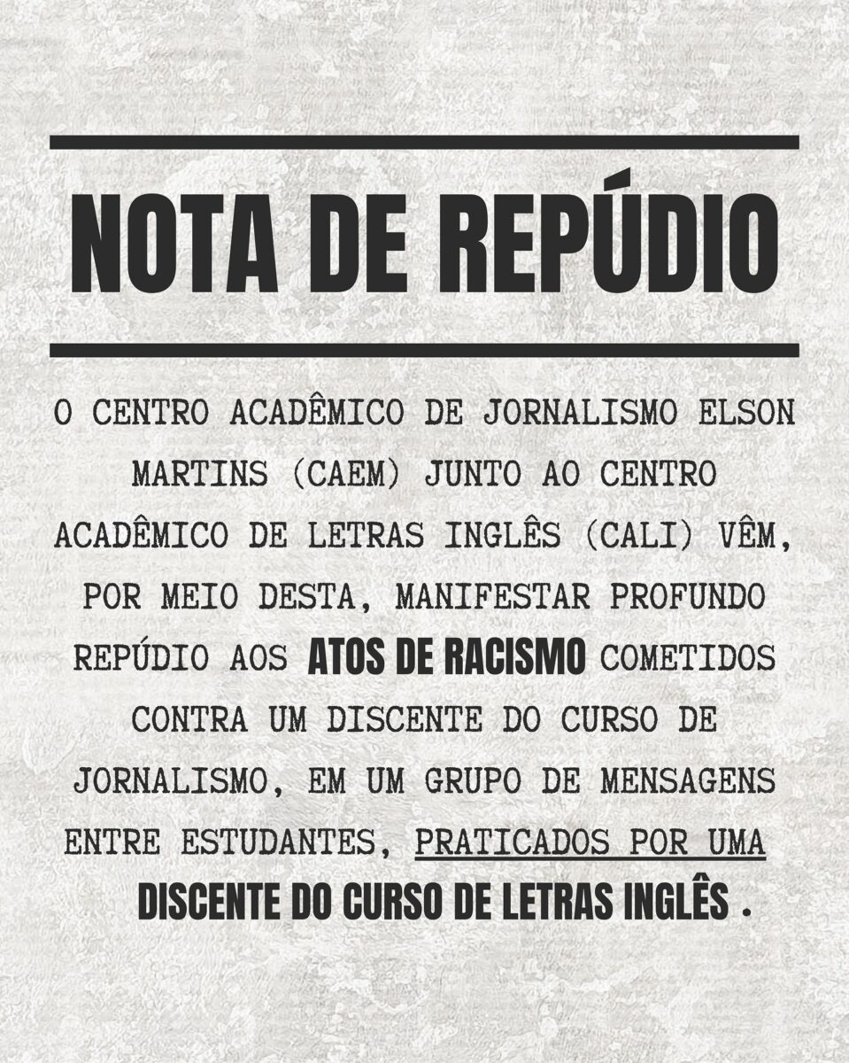 O Centro Acadêmico de Jornalismo Elson Martins (CAEM), junto ao Centro Acadêmico de Letras Inglês (CALI), publicou na tarde deste domingo (19), em suas redes sociais, uma nota de repúdio contra atos de racismo cometidos contra um discente do curso de Jornalismo da Universidade Federal do Acre (Ufac).