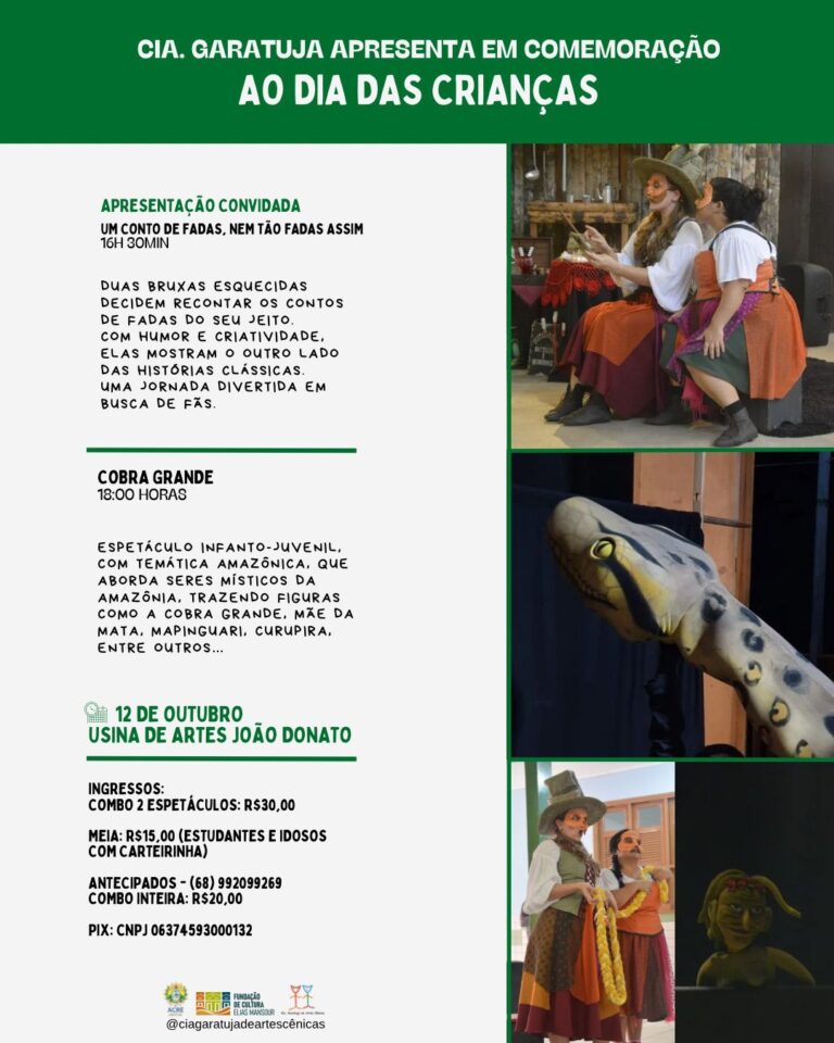 No dia 12 de outubro, a Cia. Garatuja de Artes Cênicas convida todas as famílias para uma tarde e noite cheias de magia, risadas e boas reflexões na Usina de Artes João Donato. Serão dois espetáculos pelo preço de um – uma oportunidade imperdível de celebrar a data com muito teatro, diversão e mensagens importantes.