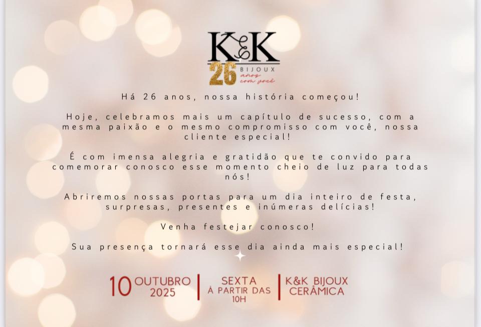 Já está em mãos desta colunista o convite para celebrar os 26 anos da K&K Bijoux, marca querida e referência em estilo e bom gosto. A comemoração acontece na próxima sexta- feira, dia 10, na K&K da Cerâmica, e promete reunir clientes, amigos e admiradores da marca em um dia repleto de charme, brilho e muitas novidades.