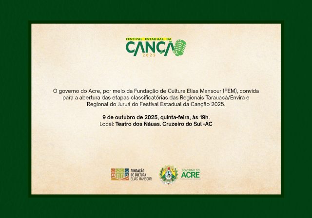 “O Festival Estadual da Canção 2025 é muito importante para a cultura acreana, pois pretende descobrir novos talentos, oferecendo uma plataforma para que jovens músicos possam se apresentar e ganhar visibilidade. Promove a diversidade cultural e celebra a riqueza musical do nosso querido estado do Acre”, destacou o secretário.