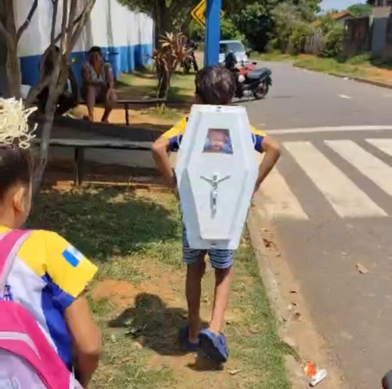 Um episódio inusitado movimentou a Escola Fernando de Azevedo, em Ouro Preto do Oeste (RO). O estudante Arthur, de apenas 8 anos, chamou a atenção de colegas e professores ao chegar para as aulas com uma mochila em formato de caixão.