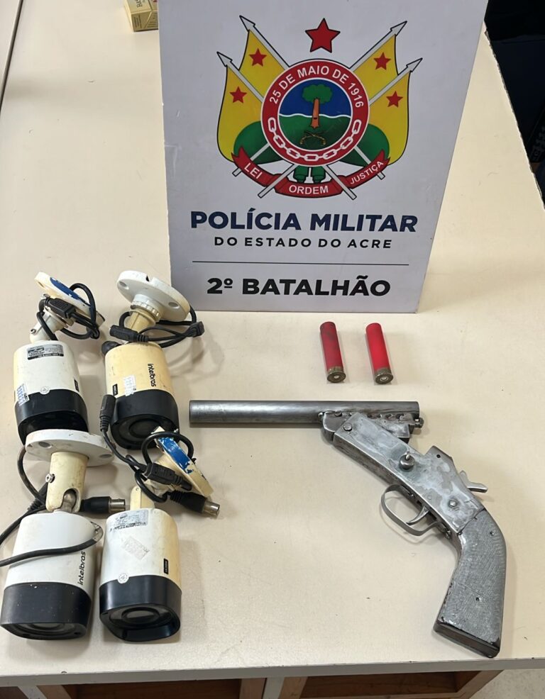 Na busca pessoal, os policiais encontraram com o adolescente uma arma de fogo tipo garrucha, calibre.28, na cor prata, carregada com dois cartuchos intactos.  Com o comparsa identificado como Robson D’Ávila, foram localizadas quatro câmeras de videomonitoramento, de procedência ainda não esclarecida.