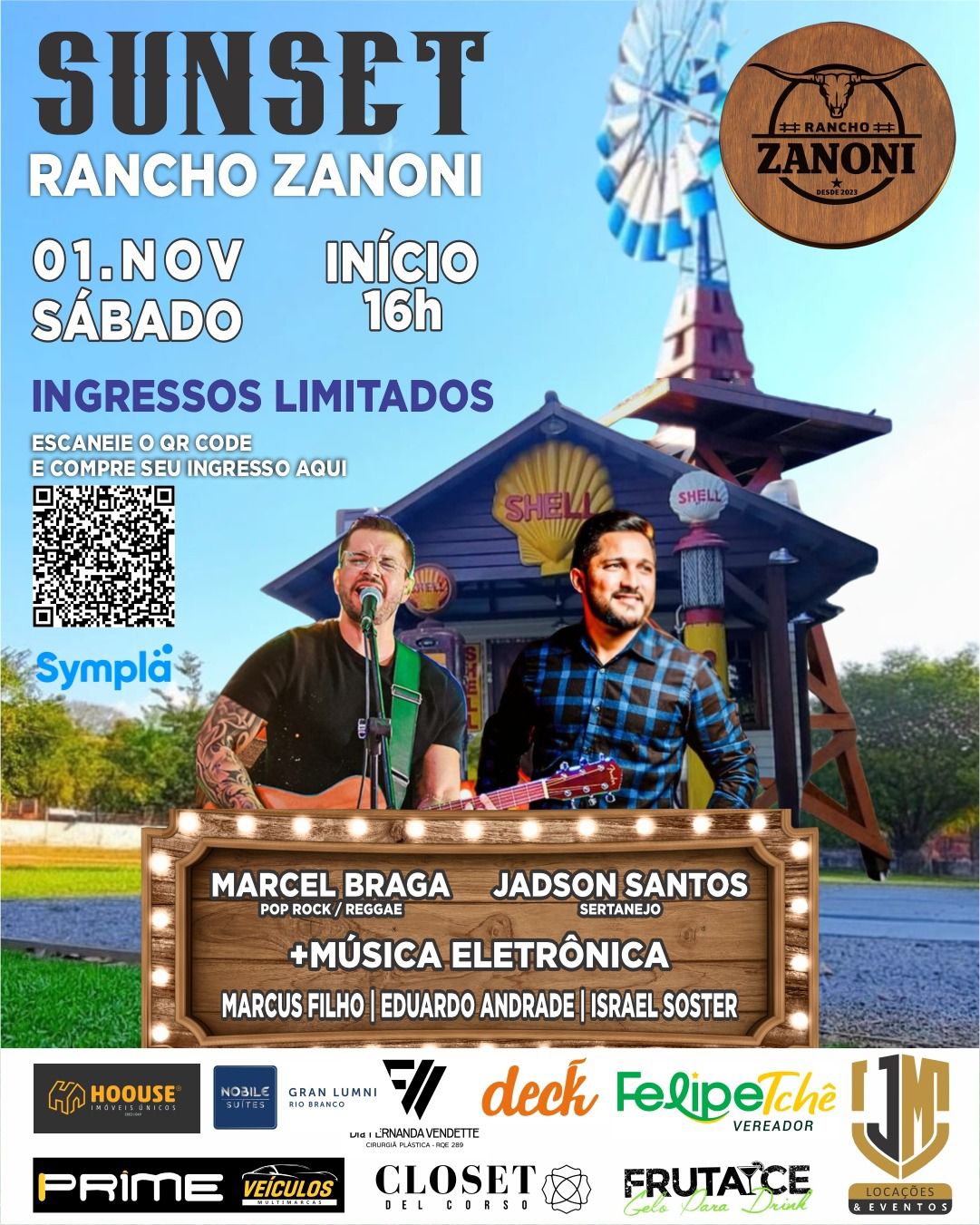 Acontece neste sábado, 1º de novembro, a aguardada festa Sunset Rancho Zazoni, a partir das 16h, prometendo uma tarde inesquecível ao som de grandes talentos musicais. O cantor Marcell Braga comandará o melhor do pop rock e reggae, Jadson Santos trará o melhor do sertanejo, e os DJs Marcus Filho, Eduardo Andrade e Israel Soster vão agitar a pista com o melhor da música eletrônica. Será um encontro especial, reunindo gente animada para celebrar o pôr do sol com boa música, energia positiva e drinks de qualidade. Garanta já o seu ingresso pelo aplicativo Sympla e viva essa experiência única no Rancho Zazoni!