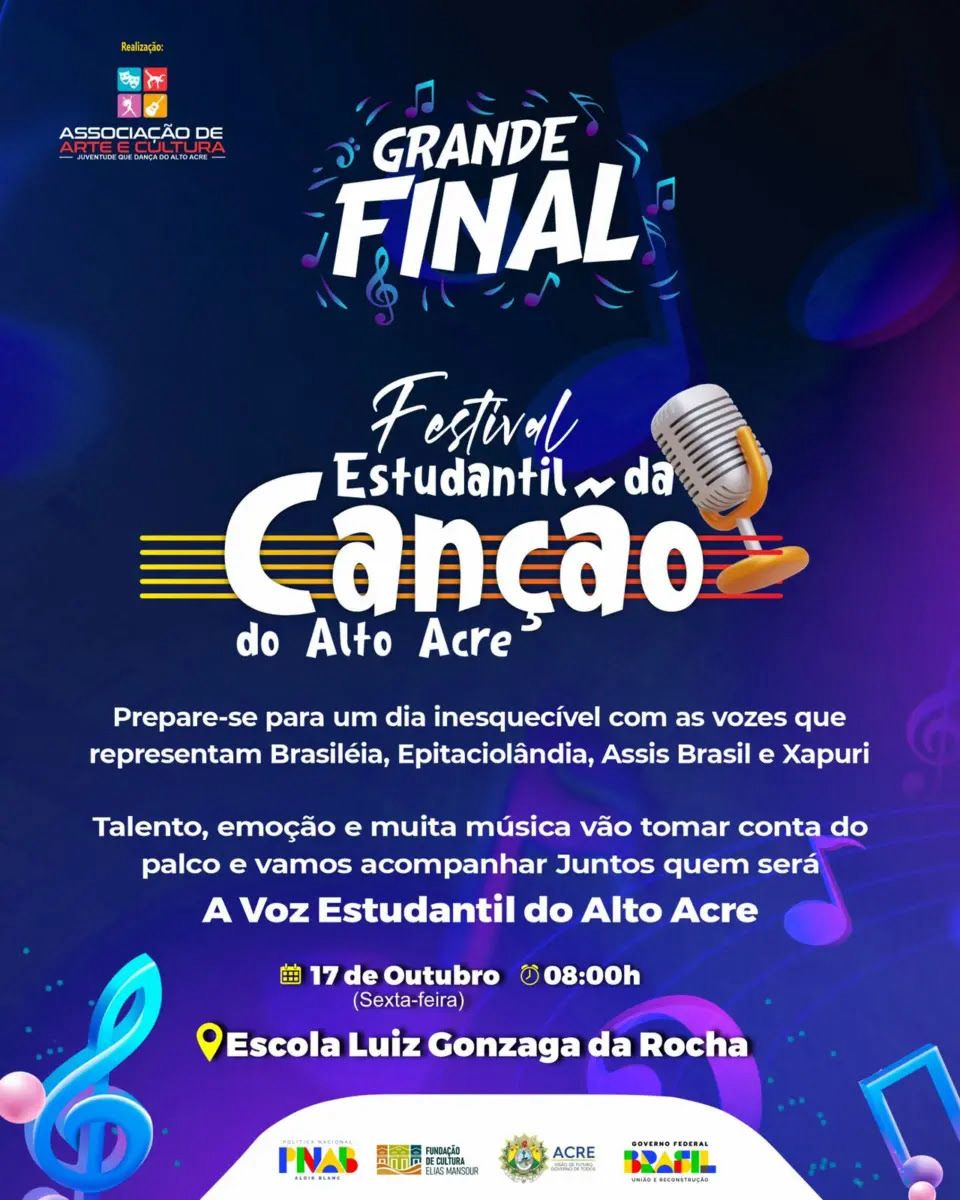 A cidade de Epitaciolândia será palco, nesta sexta-feira (17), de um dos eventos culturais mais aguardados do ano: a Grande Final do I Festival Estudantil da Canção do Alto Acre, que acontecerá na Escola Luiz Gonzaga da Rocha. A iniciativa tem como propósito valorizar a arte, a criatividade e o protagonismo dos estudantes das redes públicas de ensino de Brasileia, Epitaciolândia, Xapuri e Assis Brasil.