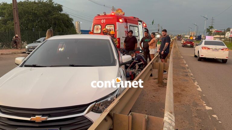 Veículo Onix branco ficou danificado após colidir contra a mureta de proteção, próximo ao Via Verde Shopping/Foto: ContilNet