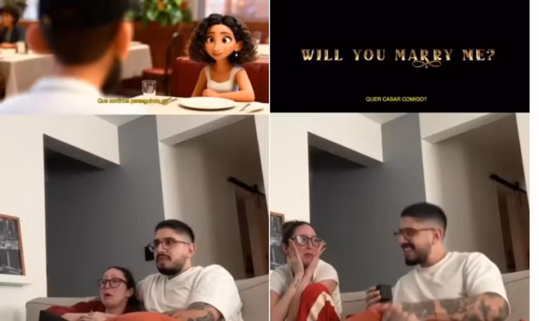 Um pedido de casamento no estilo Disney/Pixar com toque tecnológico encantou a internet. Marcelo Coelho surpreendeu a namorada, Jéssica Uinny, ao transformar a história do casal em um trailer animado criado com inteligência artificial, terminando com a clássica pergunta: “Quer casar comigo?”.