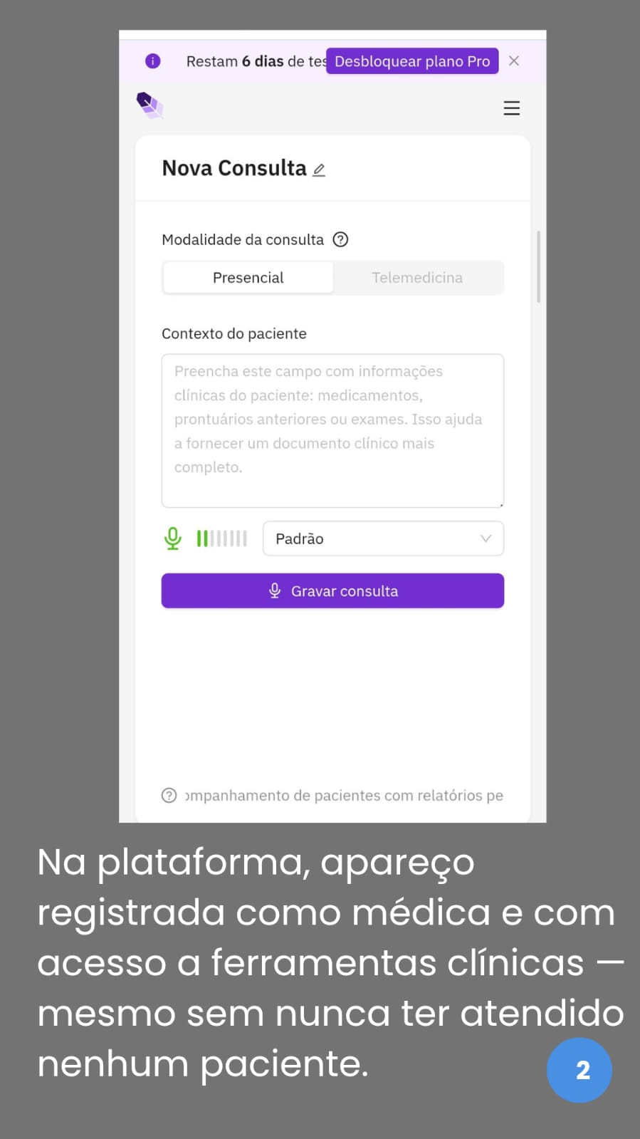 Era para ser uma simples olhadinha na plataforma. Cliquei em “teste grátis”, e pronto: virei paciente sem querer. Conversando com a minha mãe, rindo e dizendo besteira, meu filho lá atrás soltando palavrão, e o sistema registrando tudo como se fosse prontuário oficial.