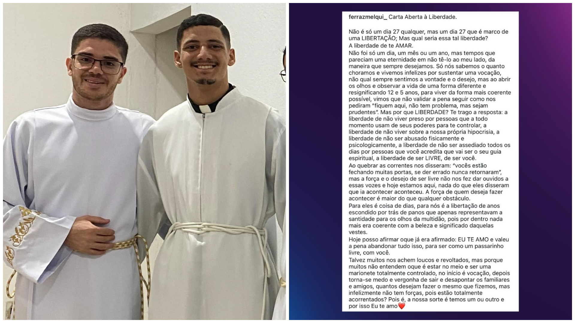 Melqui conta que, por muito tempo, sustentou uma vocação religiosa que o fazia infeliz e reprimia seus verdadeiros sentimentos. Ele revela que decidiu deixar o catolicismo para viver o amor com o companheiro e, hoje, vê essa escolha como um ato de coragem e de autenticidade. “Só nós sabemos o quanto choramos e vivemos infelizes por sustentar uma vocação na qual sempre sentimos a vontade e o desejo”, escreveu.