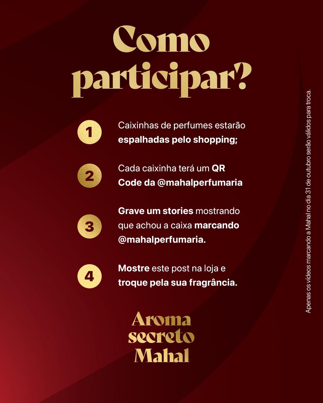 A dinâmica funciona de forma simples. Pequenas caixinhas nas cores bordô e dourado serão espalhadas por diferentes pontos do shopping. Dentro de cada uma, os participantes vão encontrar um QR Code que leva diretamente ao perfil da loja no Instagram, @mahal.perfumes, além de um bilhete elegante com instruções para garantir um brinde exclusivo.