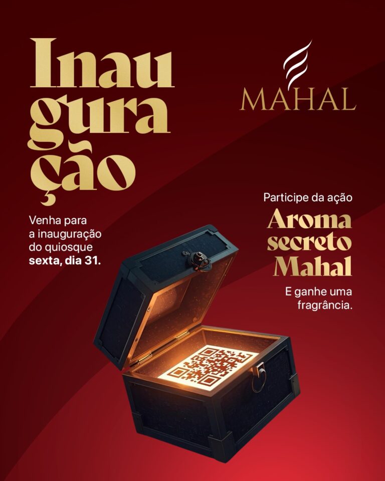 A dinâmica funciona de forma simples. Pequenas caixinhas nas cores bordô e dourado serão espalhadas por diferentes pontos do shopping. Dentro de cada uma, os participantes vão encontrar um QR Code que leva diretamente ao perfil da loja no Instagram, @mahal.perfumes, além de um bilhete elegante com instruções para garantir um brinde exclusivo.