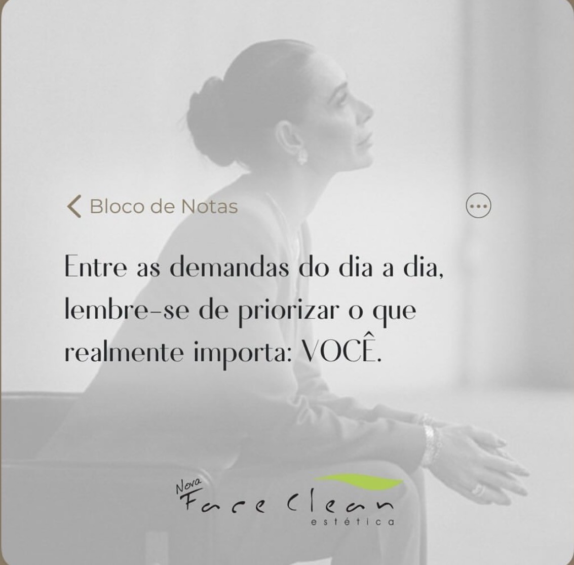 A equipe da Nova Face Clean Estética, segue inspirando suas clientes com mensagens que vão além da estética… um verdadeiro convite ao autocuidado e à pausa necessária entre as demandas do dia a dia. Afinal, priorizar-se também é um ato de amor.