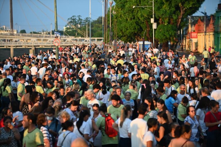 O Círio de Nazaré 2025, que chega à sua 94ª edição, começou neste domingo (12) com grande movimentação na Gameleira, ponto de partida do evento. Centenas de fiéis acompanharam a missa solene, queima de fogos e outras celebrações, enquanto aguardam o encontro das imagens de Nossa Senhora de Nazaré e Jesus Nazareno nas águas do Rio Acre. Apesar da chuva leve, o público se concentrou no local, atravessando a ponte e se preparando para a grande procissão que seguirá até a Catedral Nossa Senhora de Nazaré.