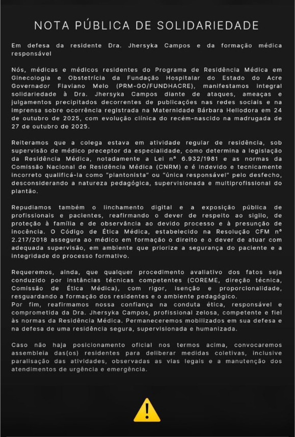 Nós, médicas e médicos residentes do Programa de Residência Médica em Ginecologia e Obstetrícia da Fundação Hospitalar do Estado do Acre Governador Flaviano Melo (PRM-GO/FUNDHACRE), manifestamos integral solidariedade à Dra. Jhersyka Campos diante de ataques, ameaças e julgamentos precipitados decorrentes de publicações nas redes sociais e na imprensa sobre ocorrência registrada na Maternidade Bárbara Heliodora em 24 de outubro de 2025, com evolução clínica do recém-nascido na madrugada de 27 de outubro de 2025.