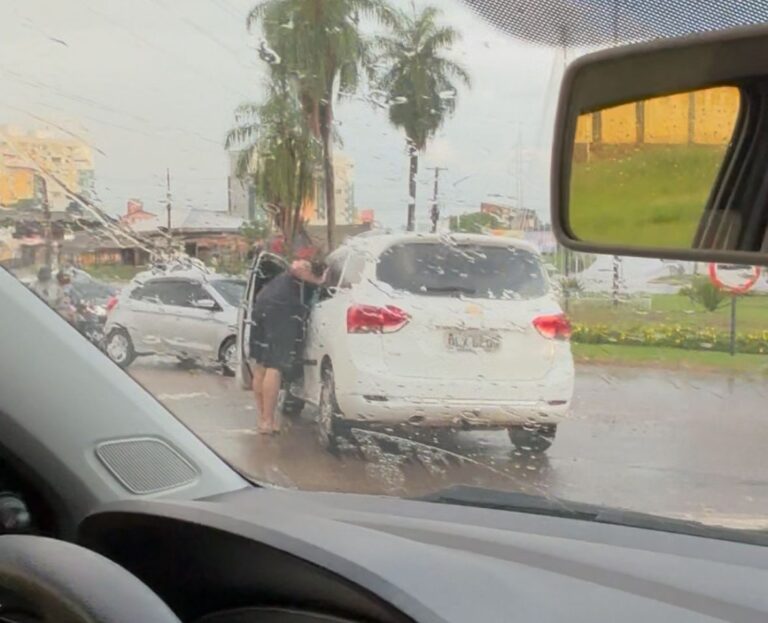 O trânsito ficou caótico na Via Verde, em Rio Branco, após um acidente registrado na rotatória da Havan na manhã desta sexta-feira (21). A forte chuva que atingiu a cidade no mesmo horário agravou ainda mais a situação e deixou o fluxo completamente comprometido.