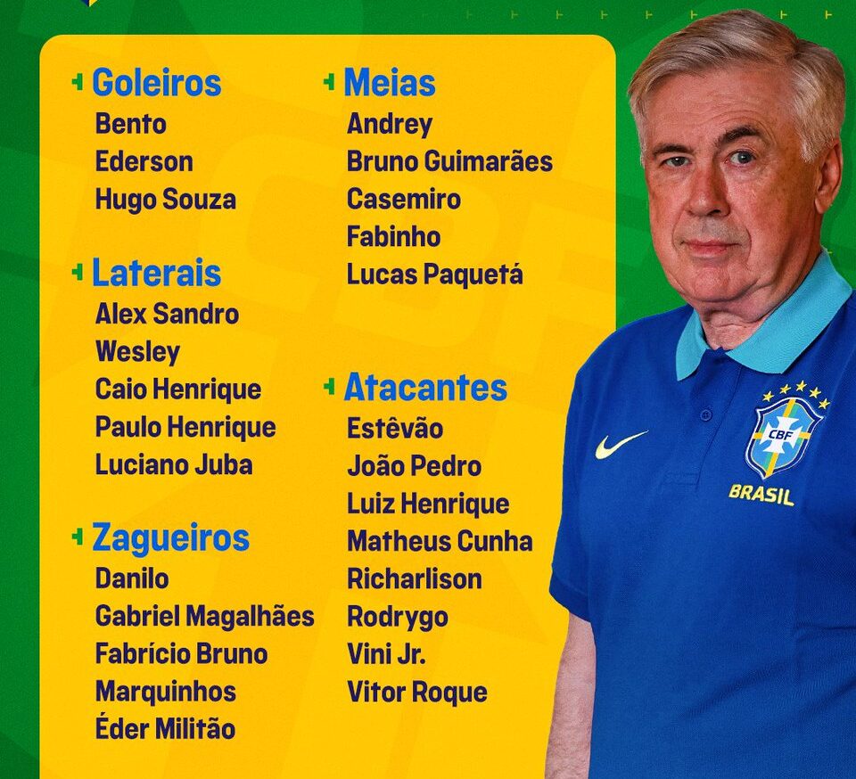 A lista completa dos convocados inclui nomes de destaque: nas laterais-esquerdas, Alex Sandro (Flamengo), Caio Henrique (Monaco) e Luciano Juba (Bahia); nas laterais-direitas, Paulo Henrique (Vasco) e Wesley (Roma). A defesa conta com Danilo (Flamengo), Éder Militão (Real Madrid), Fabrício Bruno (Cruzeiro), Gabriel Magalhães (Arsenal) e Marquinhos (PSG).
