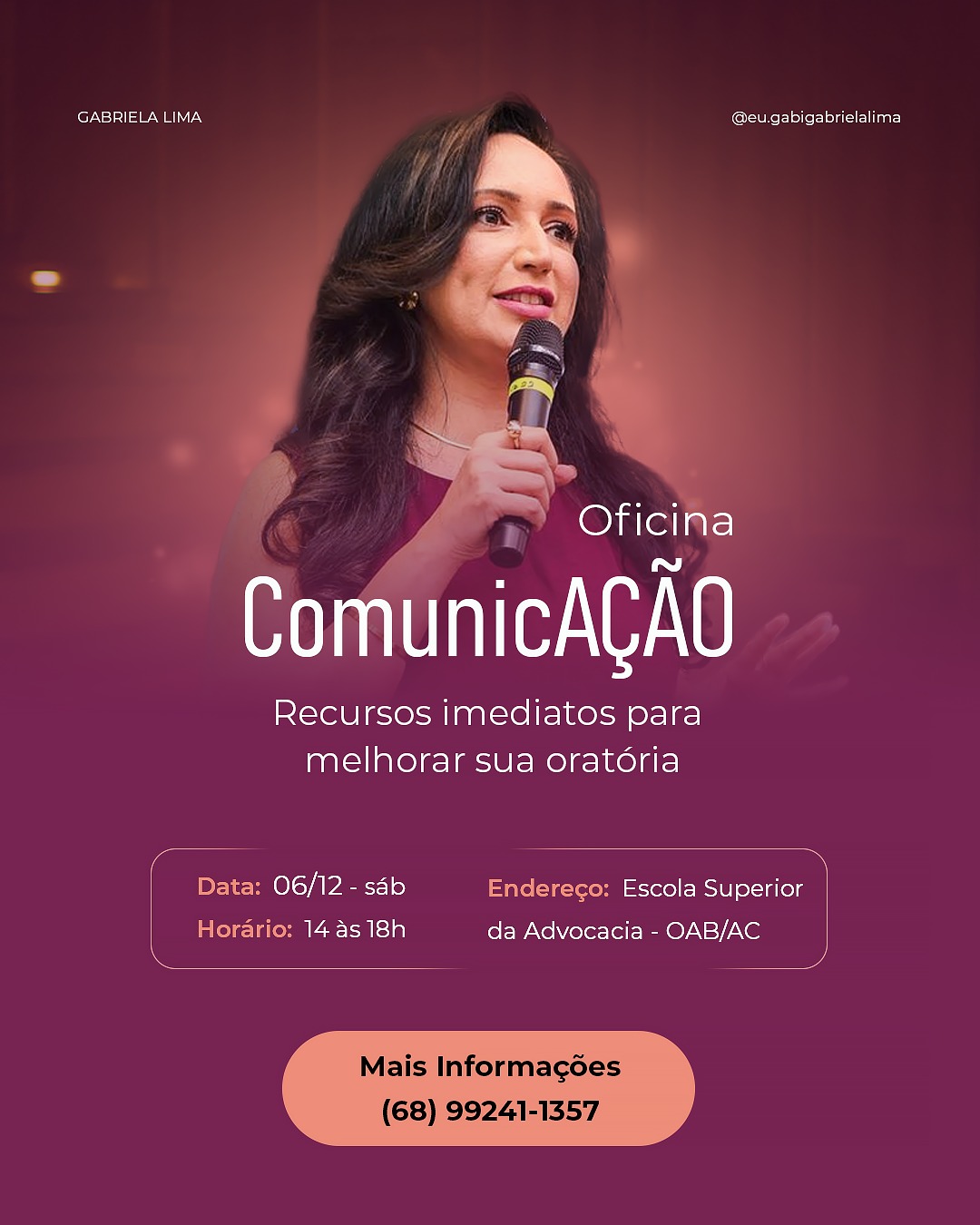 Acontece no dia 06 de dezembro, das 14h às 18h, na Escola Superior de Advocacia da OAB/AC, a Oficina ComunicAção, um encontro presencial de quatro horas voltado para quem deseja destravar a fala e fortalecer a oratória.